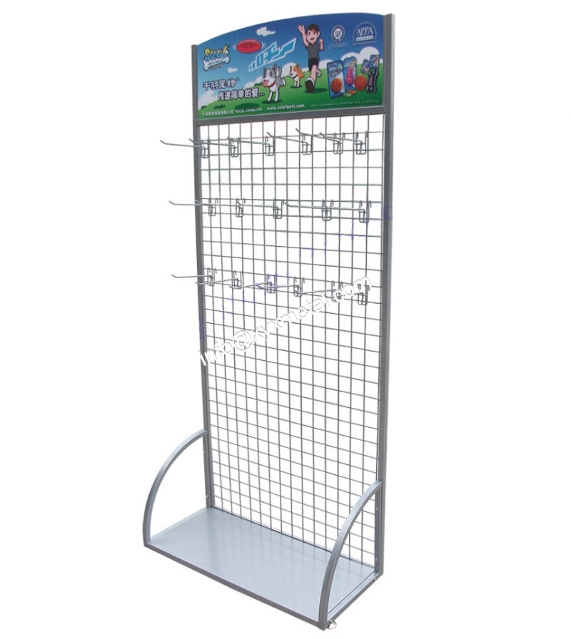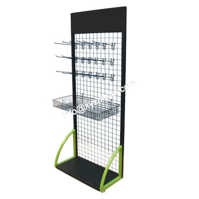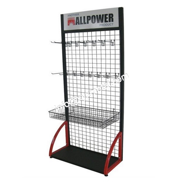 Gridwall floor rack, also named gridwall stand or gridwall display rack. This gridwall rack with one customized printed Logo to facus on the consumer's wish to purchase goods and should grab the attention, interest, desire, memory, and a series of mental activities. It is knock down design and free assembly, fast disassembly, and convenient transportation. This gridwall rack consist of gridwall board, logo board, side frame and base.