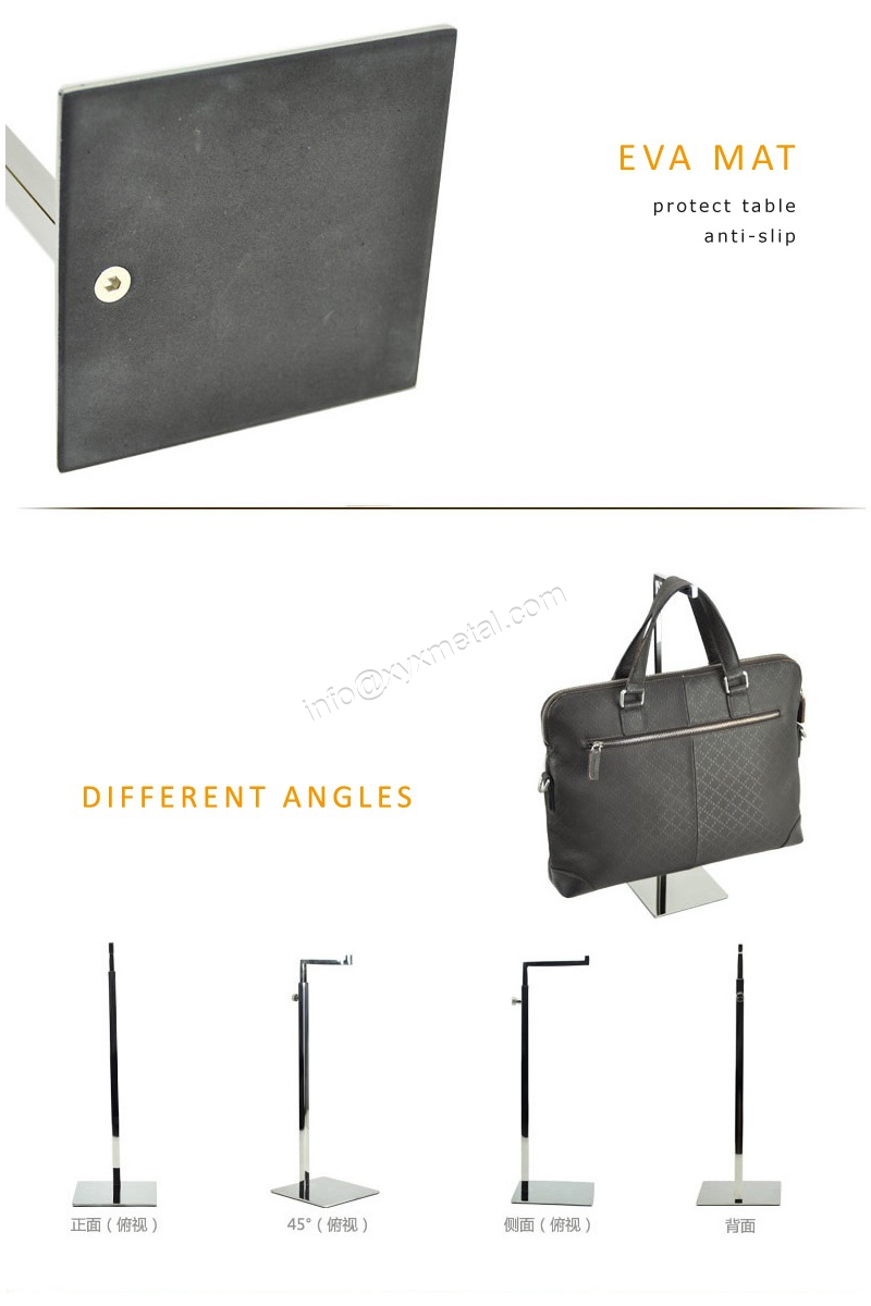 Bag display stands, also named handbag stands or handbag display stands, which is adjustable and removable design. Applies to clothing stores and bag shop. Our handbag stand is made of stainless steel and with brushed, mirror polished or powder coated finishing.