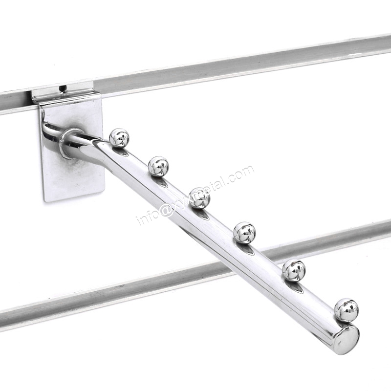 XYX METAL offers multiple options for slatwall waterfall display pipe hooks. The finishing of display pipe hooks can be chrome plated, powder coated.The circle tube of slant display pipe hooks also can be squre tube or ovel tube. And the length of slatwall display arms can be customized.
