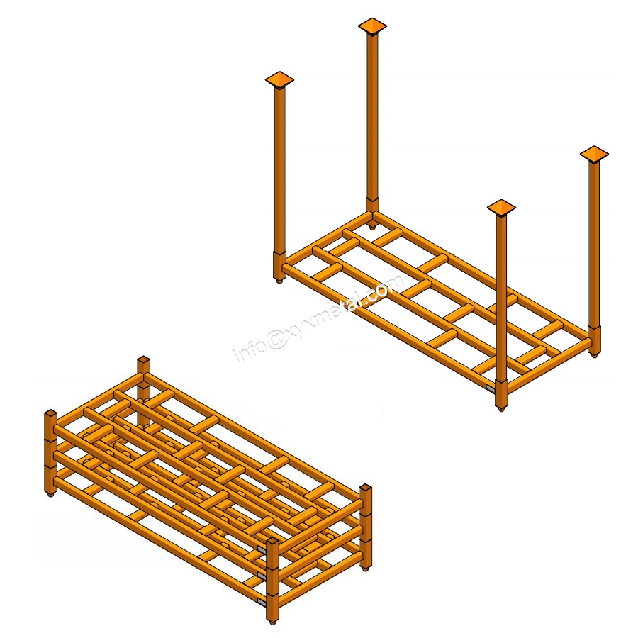 Truck Tire stack pallet, also named tire stack racks used for storage for heavy trucks, buses and farm machinery tires. This versatile and economic modular warehousing solution is very popular. The pallet base is optimized to hold 2 stacks of 6 or 7 tires depending on their diameter. The truck tire stacking rack has the same features as the TR-01 or the TR-03. It is equipped with four removable corner posts to reduce shipping costs and save space in the tire warehouse during slower periods. When removed, the posts are stowed flat between stacked pallet frames. A forklift with clamps is needed to work with this rack.